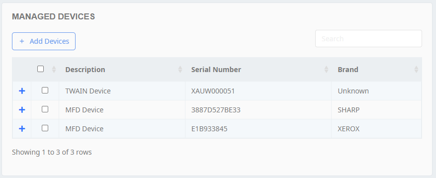 To add a new device to the available devices list, select the Add Devices button and enter the serial number(s) of the device(s) you would like to have access to Umango. Once this has been done, the device is ready to be assigned jobs.